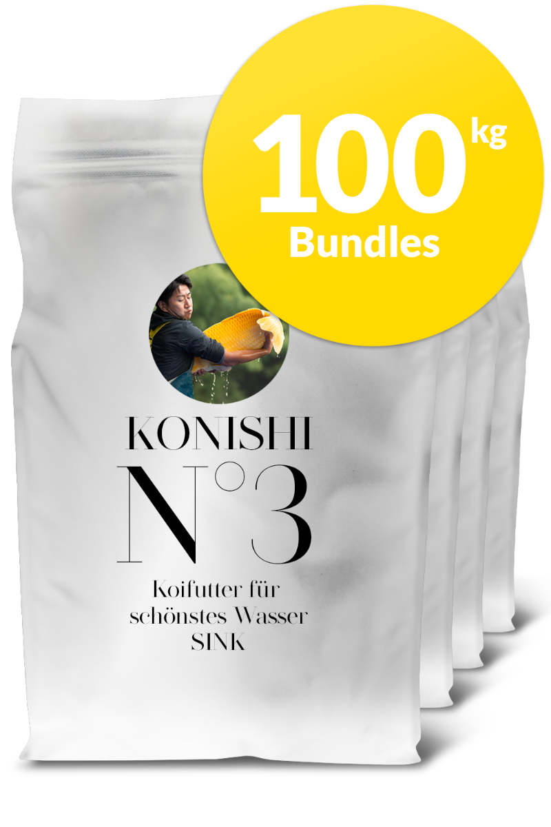 In unserer neuen ausgewogenen Rezeptur reduzieren wir den Proteingehalt von seither 40% auf nunmehr nur noch 30%. Verschiedene Versuche haben gezeigt, dass dies den Stoffwechsel der Koi entlastet, den Appetit stimuliert, die Konzentrationen an Ammonium, Nitrit, Nitrat und Phosphat bedeutend senkt, die Kotausscheidung sichtbar reduziert und das Wachstum und den Volumenaufbau von Koi fördert. Nach der Futterumstellung auf Konishi No. 3 wird sich nach einigen Wochen ein sehr klares und nahezu farbloses Teichwasser zeigen. Dies ist auf die ausgezeichnete Verwertbarkeit und Verdaulichkeit zurückzuführen. Konishi No. 3 richtet sich insbesondere an Koibestände deren Wachstumspotential nahezu ausgeschöpft (Koi ab einer Größe von ca. 70-75 cm) ist oder bei deren Besitzern die absolute Wachstumsgeschwindigkeit nicht im Vordergrund der Koihaltung steht. Dennoch kann mit Konishi No. 3 jeder Koi seine genetisch festgelegte Endgröße erreichen. Es ist ein Alleinfuttermittel und kann ganzjährig über alle Temperaturbereiche gefüttert werden. Jedoch sollte die Futtermenge der Wassertemperatur und der Aktivität der Koi stets angepasst werden. Pelletgröße: 4 - 5 mm, sink.