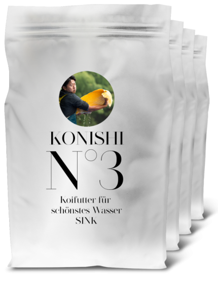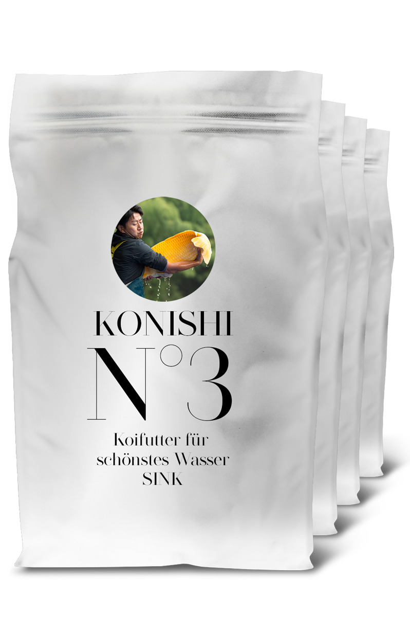 In unserer neuen ausgewogenen Rezeptur reduzieren wir den Proteingehalt von seither 40% auf nunmehr nur noch 30%. Verschiedene Versuche haben gezeigt, dass dies den Stoffwechsel der Koi entlastet, den Appetit stimuliert, die Konzentrationen an Ammonium, Nitrit, Nitrat und Phosphat bedeutend senkt, die Kotausscheidung sichtbar reduziert und das Wachstum und den Volumenaufbau von Koi fördert. Nach der Futterumstellung auf Konishi No. 3 wird sich nach einigen Wochen ein sehr klares und nahezu farbloses Teichwasser zeigen. Dies ist auf die ausgezeichnete Verwertbarkeit und Verdaulichkeit zurückzuführen. Konishi No. 3 richtet sich insbesondere an Koibestände deren Wachstumspotential nahezu ausgeschöpft (Koi ab einer Größe von ca. 70-75 cm) ist oder bei deren Besitzern die absolute Wachstumsgeschwindigkeit nicht im Vordergrund der Koihaltung steht. Dennoch kann mit Konishi No. 3 jeder Koi seine genetisch festgelegte Endgröße erreichen. Es ist ein Alleinfuttermittel und kann ganzjährig über alle Temperaturbereiche gefüttert werden. Jedoch sollte die Futtermenge der Wassertemperatur und der Aktivität der Koi stets angepasst werden. Pelletgröße: 4 - 5 mm, sink.
