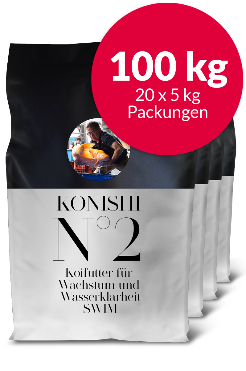 Konishi No. 2 bildet in unserem neuen Futtersortiment den goldenen Mittelweg zwischen maximalem Focus auf Wachstum und optischer Schönheit des Wassers. Auch bei Konishi No. 2 wurde der Proteingehalt von 40% auf 30% reduziert, was sich in einem entlasteten Stoffwechsel, gesteigertem Appetit, Verringerung der Konzentration an Ammonium, Nitrit, Nitrat, Phosphat und einer Reduzierung der Kotausscheidung bemerkbar macht. Somit werden Sie bei der Fütterung von Konishi No. 2 sowohl in den optischen Genuss einer herausragenden Wasserqualität gelangen, als auch Ihren Koi praktisch beim Wachsen zuschauen zu können. Somit empfiehlt sich Konishi No. 2 sowohl an kleine Koi als auch an große, bei denen es um die letzten Zentimeter geht. Es ist ein Alleinfuttermittel und kann ganzjährig über alle Temperaturbereiche gefüttert werden. Jedoch sollte die Futtermenge der Wassertemperatur und der Aktivität der Koi stets angepasst werden